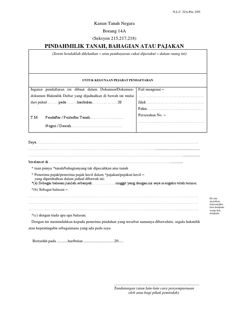 Melekatkan setem hasil rm 10 di atas borang 14a dan dimatikan di pejabat pemungut duti setem ii. 2 85 kanun tanah negara borang 14 a seksyen 215 217 218 pindahmilik tanah bahagian atau pusaka setem hendaklah dilekatkan atau pembayaran cukai di perakui dalam ruang ini. Link dia boleh tanya kat pakcik google sila gunakan hanya pen hitam dakwat. Peraturan 99 jtb boleh membuat tuntutan bayaran ukur mengikut kemajuan kerja dengan menyertakan dokumen sokongan berkaitan seperti borang ljt 14a.