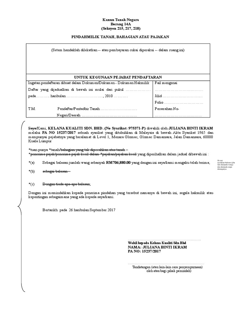 Borang pindah milik 14a hendaklah bersaiz a3 depan dan belakang 2. Pendaftaran hendaklah dihantar tidak lewat dari tempoh tiga 3 bulan dari tarikh borang 14a ditandatangani. 14 surat akuan dalam bahasa malaysia bagi pemegang amanah jika ada. Kalau xpuas hati boleh keluar dari.