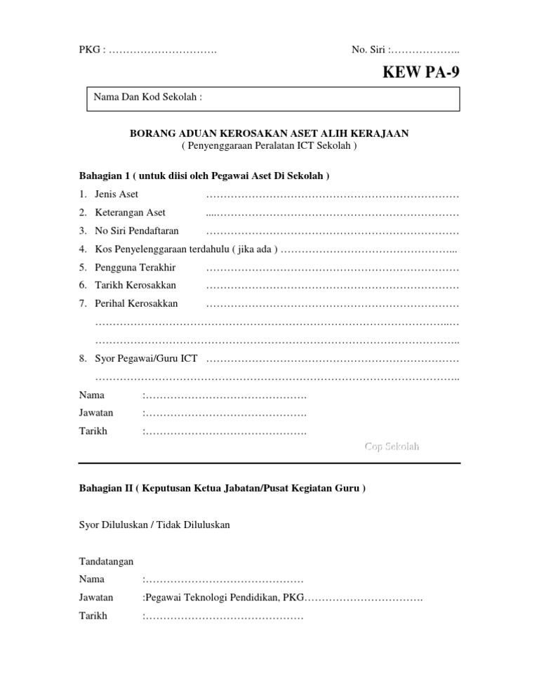 Borang ini hanya digunakan untuk aset jabatan bendahari negeri sabah sahaja. Kew pa 9 borang aduan kerosakan aset alih kerajaan bahagian i untuk diisi oleh pegawai aset 1. Borang aduan kerosakan aset alih kerajaan.