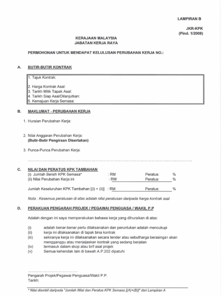 Borang b jkr. Dan appendiks kepada syarat syarat kontrak. Appendices for building works. Standard form muka depan guide on the use. Senarai semakan dokumen permohonan pelan jalan dan parit.