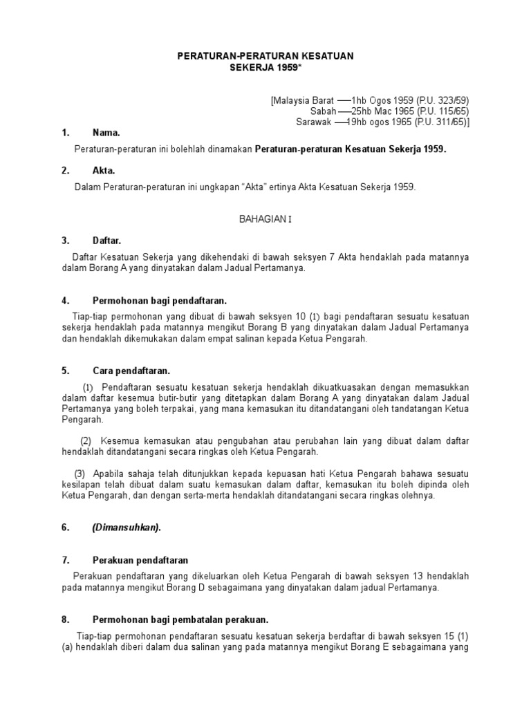 Borang akaun yang akan diberikan oleh bendahari atau pegawai lain yang bertanggungjawab bagi akaun akaun sesuatu kesatuan sekerja form n penyata tahunan yang ditetapkan di bawah seksyen 56 1 akta kesatuan sekerja dan peraturan 28 bagi tahun berakhir 31 mac. Sesebuah kesatuan sekerja perlu didaftarkan bagi membolehkannya menikmati hak dan keistimewaan sebagai sebuah kesatuan yang sah di sisi undang undang. Academia edu is a platform for academics to share research papers. Borang bb akta kesatuan sekerja 1959 seksyen 73 dan peraturan 19 permohonan.