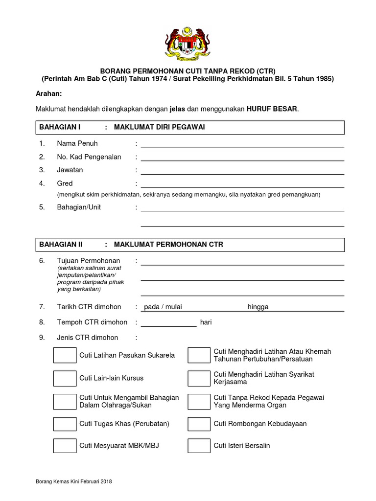 Borang kemas kini februari 2018 ctr bagi pegawai yang dilantik sebagai jurulatih plkn cuti tanpa rekod perayaan vaisakhi cuti menghadiri perbicaraan mahkamah di luar stesen cuti tanpa rekod hari gawai cuti tanpa rekod pesta kaamatan cuti umrah 10. Maklumat permohonan jenis jenis kemudahan cuti tidak berekod cuti isteri bersalin sila tandakan pada petak yang berkenaan. Maklumat diri pegawai 1. Meliputi hari rehat mingguan hari kelepasan mingguan dan hari kelepasan am.