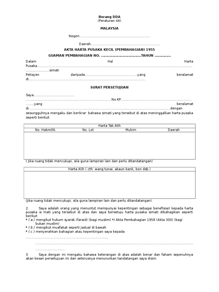 Borang dda peraturan 4a malaysia senaraikan harta tak alih yang dituntut seperti di borang a atau borang p 1. Saya ialah orang yang menuntut mempunyai kepentingan dalam harta pusaka tersebut sebagai benefisiari kepada harta pusaka si mati yang tersebut di atas dan bersetuju harta pusaka si mati dibahagikan seperti yang berikut. Walaubagaimanapun bagi yang tidak biasa dengan istilah borang borang dan pengurusan harta pusaka secara umum mungkin akan melihat proses ini adalah sukar dan memenatkan. A selaras dengan undang undang islam faraid bagi orang islam akta.