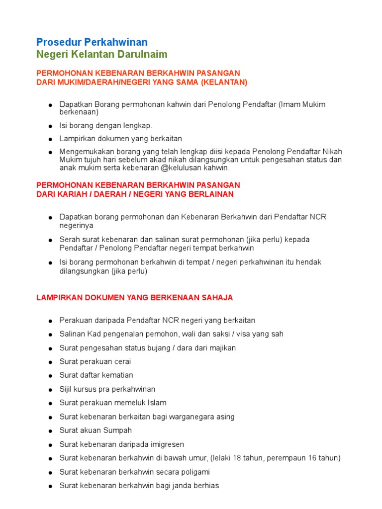 Borang e nikah kelantan. Pemohon boleh mengisi borang permohonan seawal awalnya 90 hari dari tarikh akad nikah atau selewat lewatnya 7 hari untuk warganegara malaysia. Pemohon hendaklah seorang yang bermastautin di dalam negeri kelantan kod 03 atau 29 di dalam kad pengenalan atau beralamat kelantan di dalam kad. Sedia maklum permohonan kebenaran berkahwin online pada masa ini hanya meliputi permohonan yang dibuat di negeri negeri sembilan melaka perlis kedah perak dan wilayah persekutuan. Untuk warganegara asing pula adalah 21 hari sebelum tarikh akad nikah.