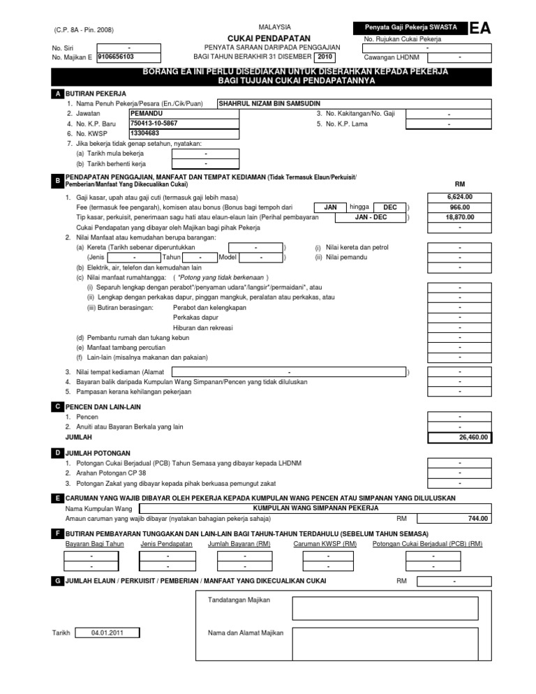 Borang ea pekerja. Borang ini wajib diberikan kepada setiap pekerja oleh itu kepada para majikan jangan lupa sediakan dan bekalkan borang tersebut. Jumlah tuntutan potongan oleh pekerja melalui borang tp1 berkaitan. Penyata gaji pekerja swasta ea no. Di bahagian a butiran pekerja tiada lagi ruangan butiran suami bagi wanita yang telah berkahwin.