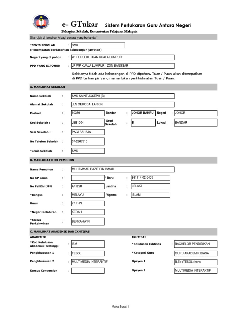 Borang manual ini biasa diisi untuk kes tertentu seperti bercuti tanpa gaji perubahan maklumat dan beberapa perkara lagi. Kepada mereka yang berkhidmat di kementrian pendidikan dan bukan seorang guru kini anda boleh mengisi borang pertukaran bukan guru secara online. Berita baik kepada semua guru guru di malaysia. Boleh dikatakan beribu permohonan diisi oleh guru di seluruh malaysia untuk berpindah sama ada berpindah antara negeri antara daerah atau dalam daerah.