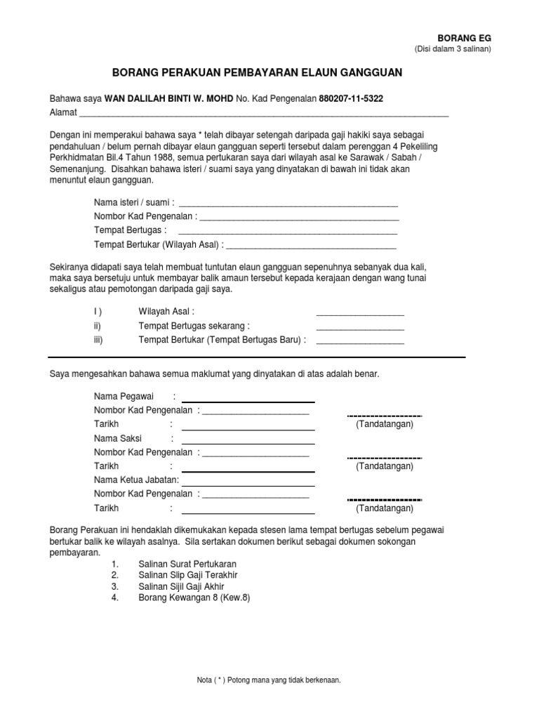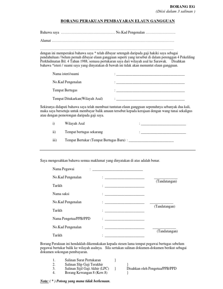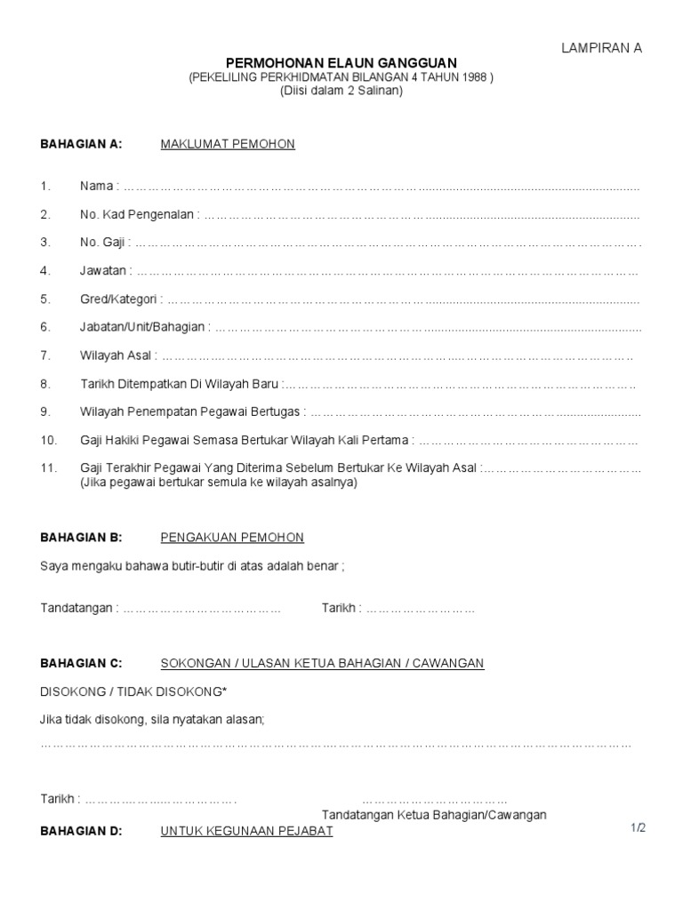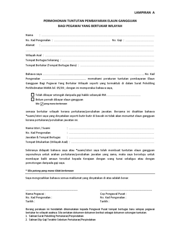 Borang elaun gangguan. Borang tuntutan elaun gangguan bagi pegawai yang bertukar wilayah 3. Adakah terdapat tempoh masa untuk tarikh mengemukakan tuntutan elaun. Tuntutan elaun gangguan perlu dikemukakan oleh pegawai kepada ketua. Borang kemas kini januari 2017 1 permohonan elaun gangguan pekeliling perkhidmatan bilangan 4 tahun 1988 bahagian a.