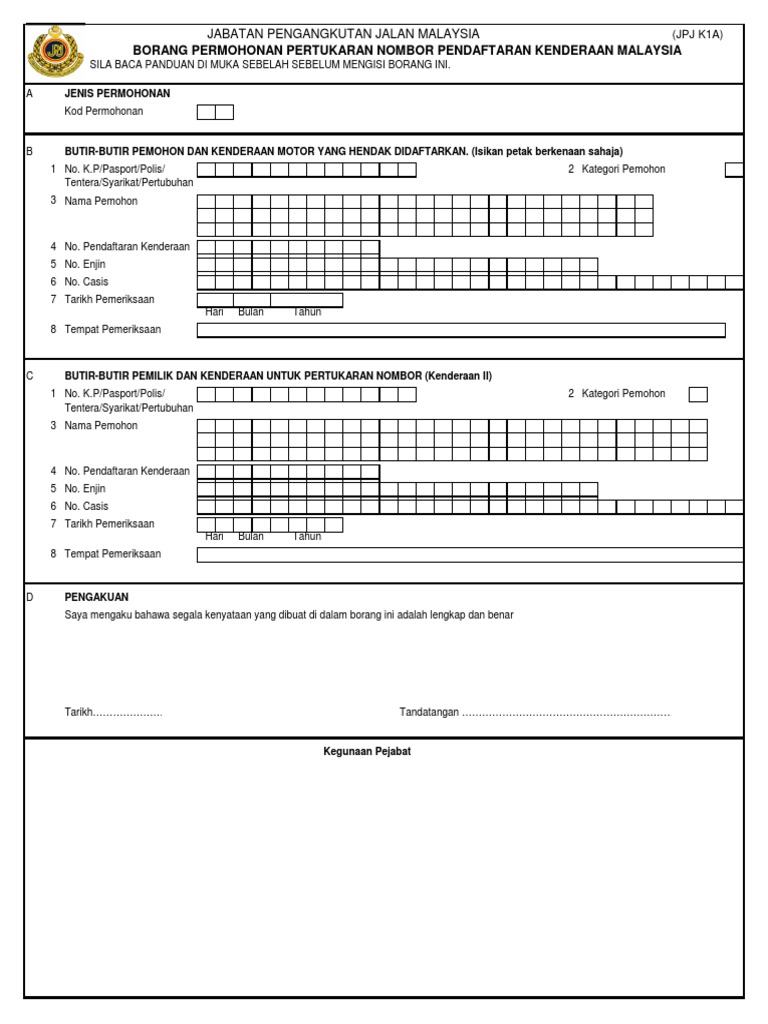Borang jpj k1a. The jabatan pengangkuatan jalan jpj k1 form has to be filled if you are planning to register a motor vehicle in malaysia. Surat borang keputusan tempahan nombor pendaftaran kenderaan yang berjaya jika berkenaan. 26 jalan tun hussien presint 4 pusat pentadbiran kerajaan persekutuan 62100 wp putrajaya 60 3 8000 8000 umum. Motor hilang number ambil balik.