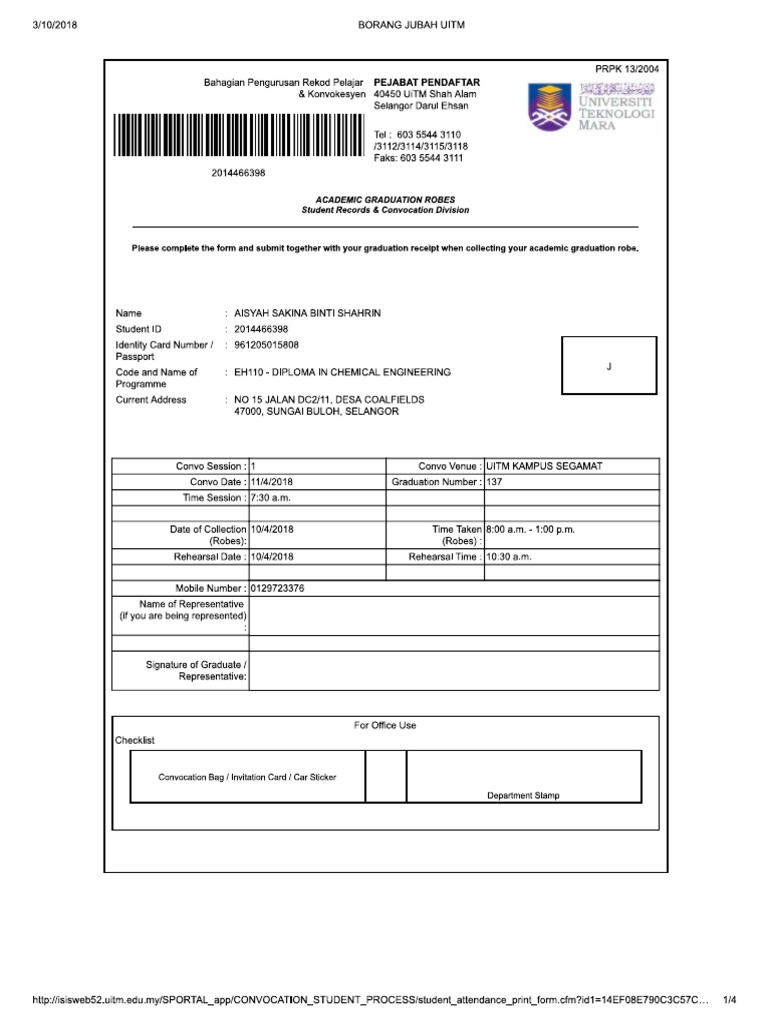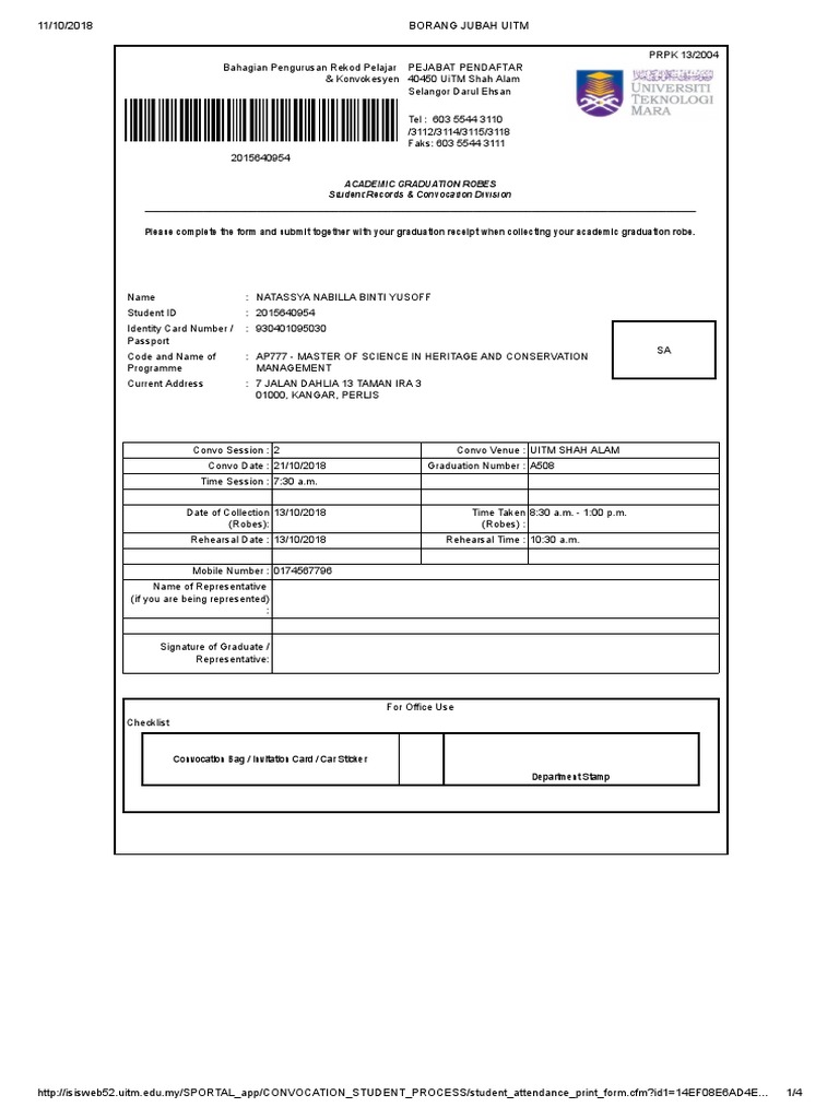 Bahagian pengurusan rekod pelajar dan konvokesyen adalah pusat utama yang mengendalikan pengurusan rekod pelajra yang melibatkan penyenggaraan dan pengemaskinian rekod pelajar bagi urusan pengijazahan dan seterusnya pengendalian istiadat konvokesyen. Sila bawa dokumen berikut semasa hari pengambilan jubah a borang jubah akademik graduan yang telah ditandatangani. This is a form for uitm student to grab their jubah for covocation. Kalau kau nak jubah terbaik untuk badan kau.