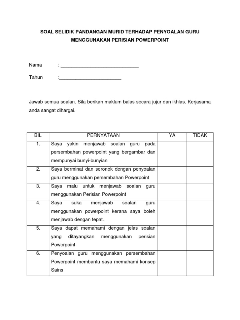 Maklum balas ini akan dapat membantu bahagian pengurusan latihan kkm menilai keberkesanan latihan dan membuat perancangan yang lebih komprehensif bagi modal insan kementerian kesihatan malaysia. Borang soal selidik borang soal selidik ini dikemukakan untuk mendapatkan maklum balas dan menilai persepsi masyarakat melayu di daerah pengkalan hulu perak terhadap haiwan fasiq. Islam buddha hindu lain lain 6 taraf perkahwinan. Step 1 of 5.
