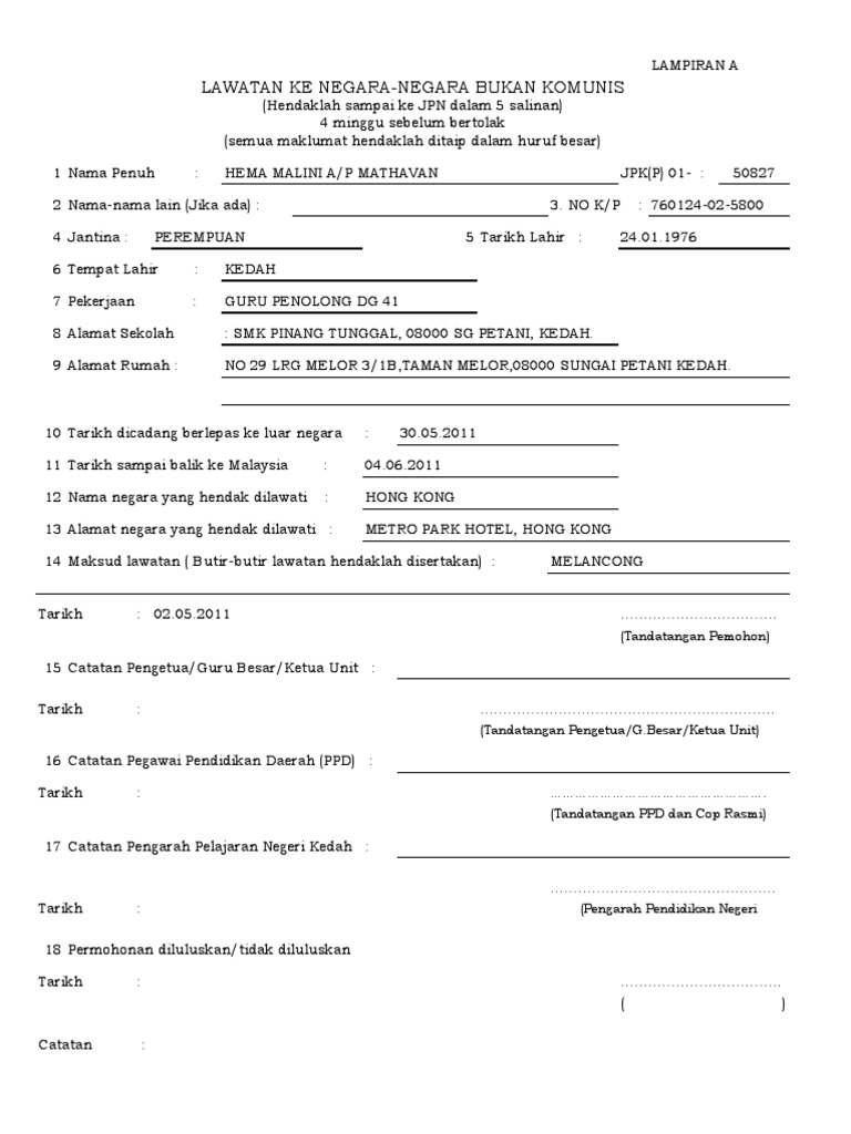 Jabatan perdana menteri bangunan perdana putra pusat pentadbiran kerajaan persekutuan 62502 putrajaya malaysia 03 8000 8000 03 8888 3528 3646 pertanyaan. Borang permohonan tugas rasmi luar pejabat. Pegawai bertanggungjawab untuk mendapatkan maklumat untuk dihubungi di perwakilan malaysia di luar negara terlibat sekiranya memerlukan sebarang bantuan atau menghadapi masalah seperti penginapan hotel dan sebarang kecemasan. Jabatan ini akan mengemaskini maklumat kematian si mati di dalam sistem jpn dan satu 1 surat perakuan pengesahan kematian akan dikeluarkan kepada pemohon.