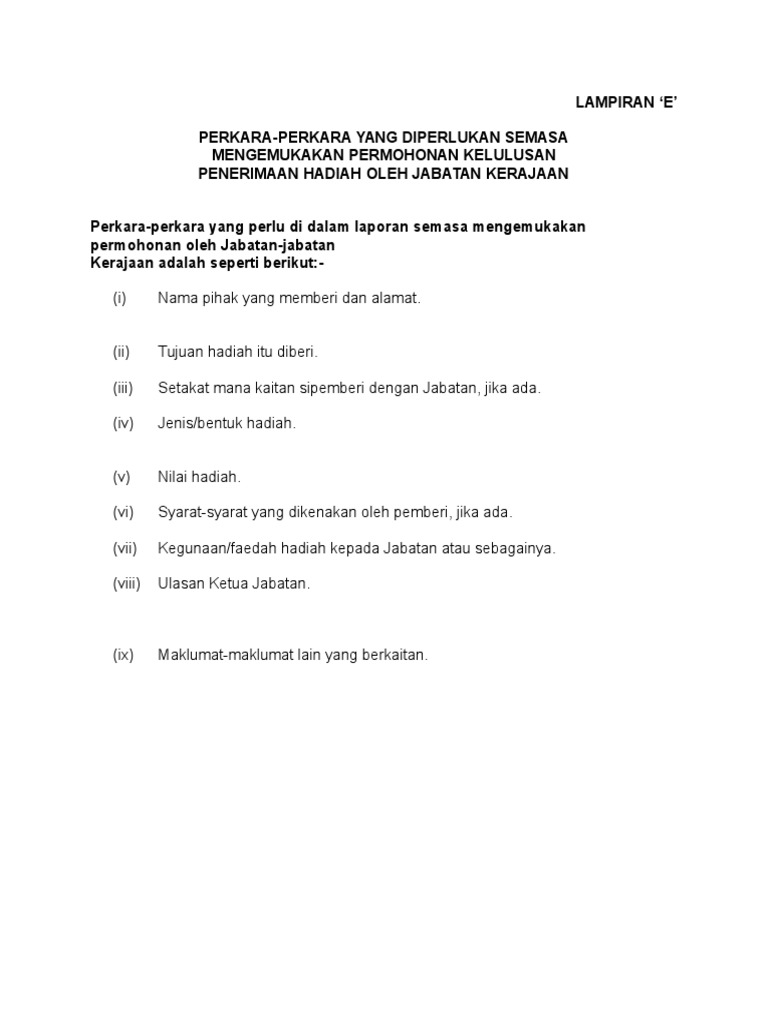 Pekeliling perkhidmatan bilangan 3 tahun 1998 garis panduan pemberian dan penerimaan hadiah di dalam perkhidmatan awam created date. I borang permohonan penerimaan aset hadiah ii borang d iii borang e tindakan. Berikut di lampirkan lampiran a dan e bagi kebenaran penerimaan hadiah oleh. Tuan lampiran a dan e kebenaran penerimaan hadiah oleh pegawai awam.