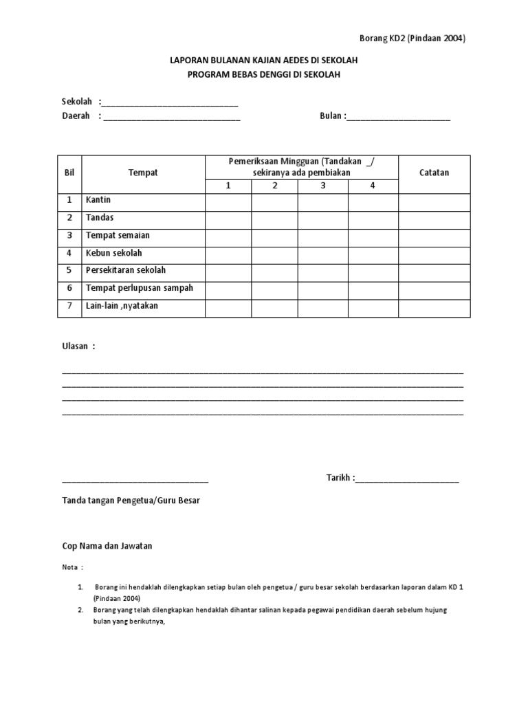 Borang laporan denggi di sekolah. Borang kd 1 pindaan 2004 program bebas denggi di sekolah laporan mingguan kajian aedes di sekolah sekolah. Borang ini hendaklah dilengkapkan setiap bulan oleh pengetua guru besar sekolah berdasarkan laporan dalam borang kd 1 pindaan 2004 2. Sabak bernam bulan. Lampiran d kd 1 laporan mingguan kajian aedes di sekolah sekolah.