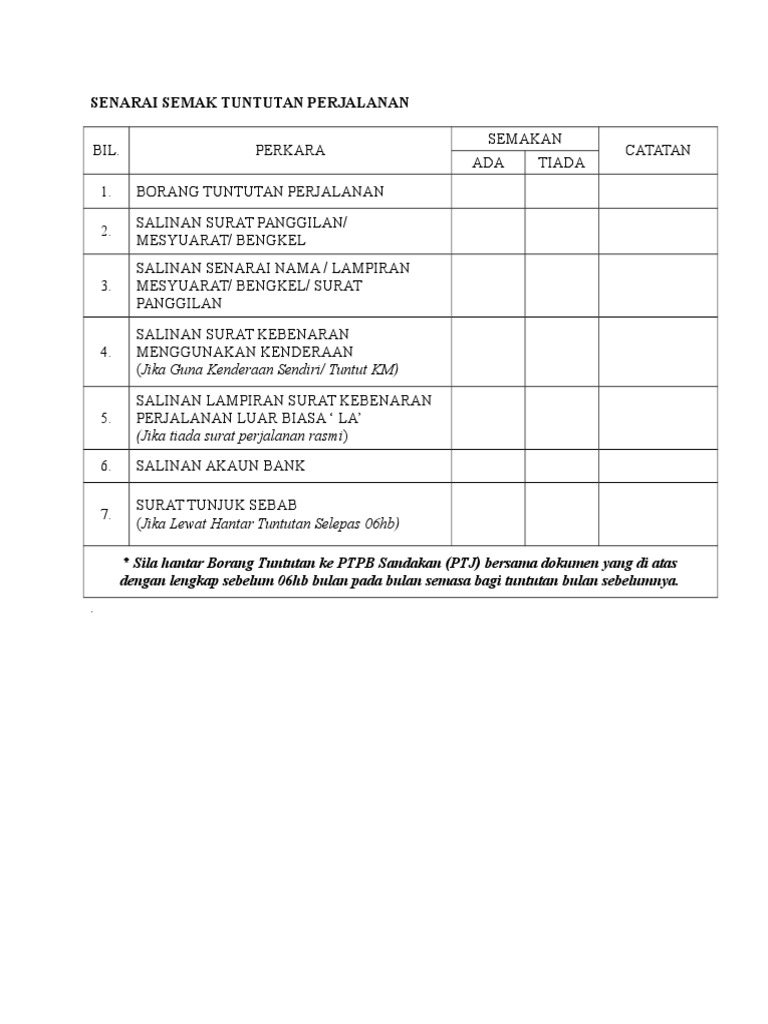 Contoh surat tunjuk sebab sebab lewat hantar tuntutan perjalanan. Penjelasan oleh staf yang membuat tuntutan perjalanan tuntutan perjalanan ini lewat dikemukakan kerana. Borang claim tuntutan perjalanan. Seorang pegawai yang menggunakan kenderaan yang disediakan oleh kerajaan atau penganjur semasa menjalankan tugas rasmi tidak layak menuntut elaun.