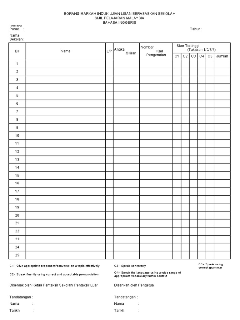 Borang markah induk ujian lisan berasaskan sekolah sijil pelajaran malaysia 2011 bahasa inggeris nombor pusat. Manual ulbs bahasa inggeris spm. Skor tertinggi nombor taksiran angka bil nama l p kad 1 2 3 4 giliran pengenalan k1 k2 k3 k4 jumlah 1 0 2 0 3 0 4 0 5 0 6 0 7 0 8 0 9. Jea1042 nama sekolah.