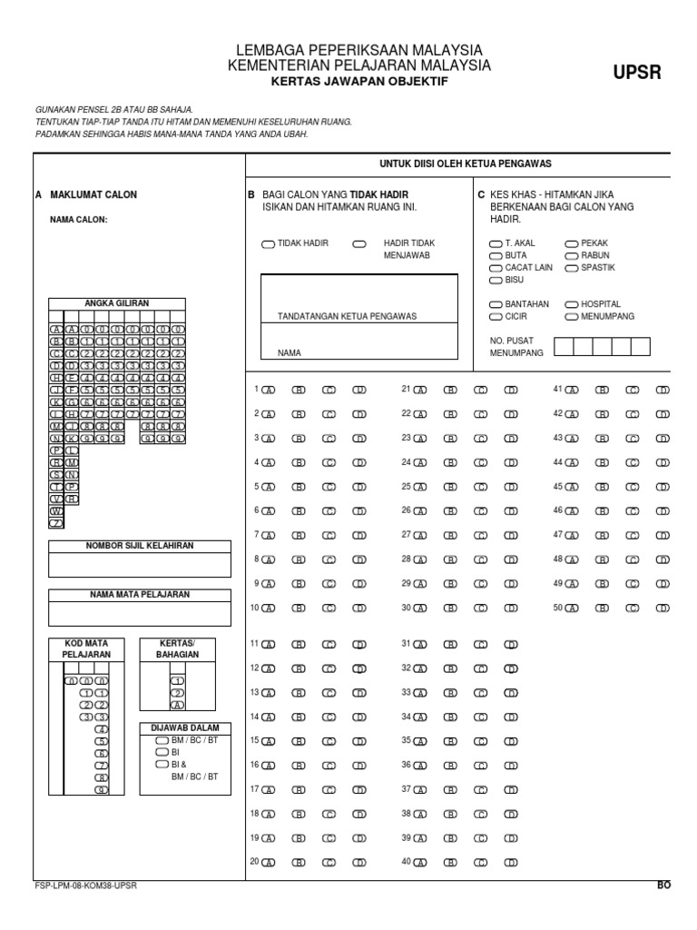 Jadi saya sediakan kertas jawapan ini untuk memudahkan proses penyemakan dan penggunaan kertas juga. Bank soalan upsr sistem guru online menyediakan pelbagai bahan meliputi soalan soalan upsr nota nota padat soalan peperiksaan. Kurang arif tentang subjek lain namun bagi subjek bahasa melayu soalan objektifnya berjumlah 20 soalan lebih sedikit bilangan berbanding format sebelumnya. 1 26 2 27 3 28 4 29 5 30 6 31 7 32 8 33 9 34 10 35 11 36 12 37 13 38 14 39 15 40 fill in the entries in the omr sheet.