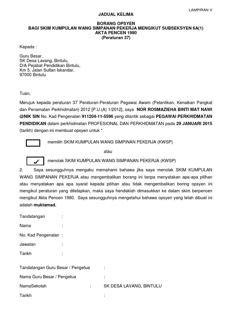 Borang Opsyen Kwsp Jadual Kelima