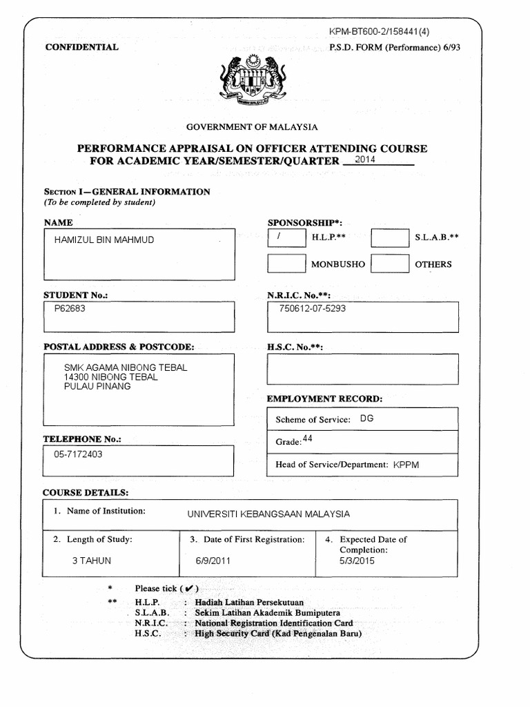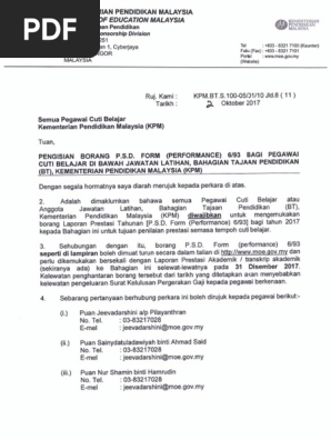 Borang p s d form performance 6 93. Form performance 6 93 kemukakan 2 salinan borang ini ke bahagian biasiswa pada setiap awal disember. Form performance 6 93 semasa penempatan di ipt. P s d form performance 6 93 borang kpm 5 12 a jika calon lapor diri ikut langkah 5 16 b jika calon tidak lapor diri ikut langkah 5 13 ptj jkbcb penyelia 5 13 a terima dan timbang permohonan untuk perkara perkara berikut. 8 jan 2012 ahad pengisian borang penilaian prestasi p s d form 6 93 tahun 2011 bagi pegawai perkhidmatan pendidikan ppp yang diluluskan cuti belajar dan mengisi jawatan latihan bahagian tajaan pendidikan kementerian pelajaran malaysia.