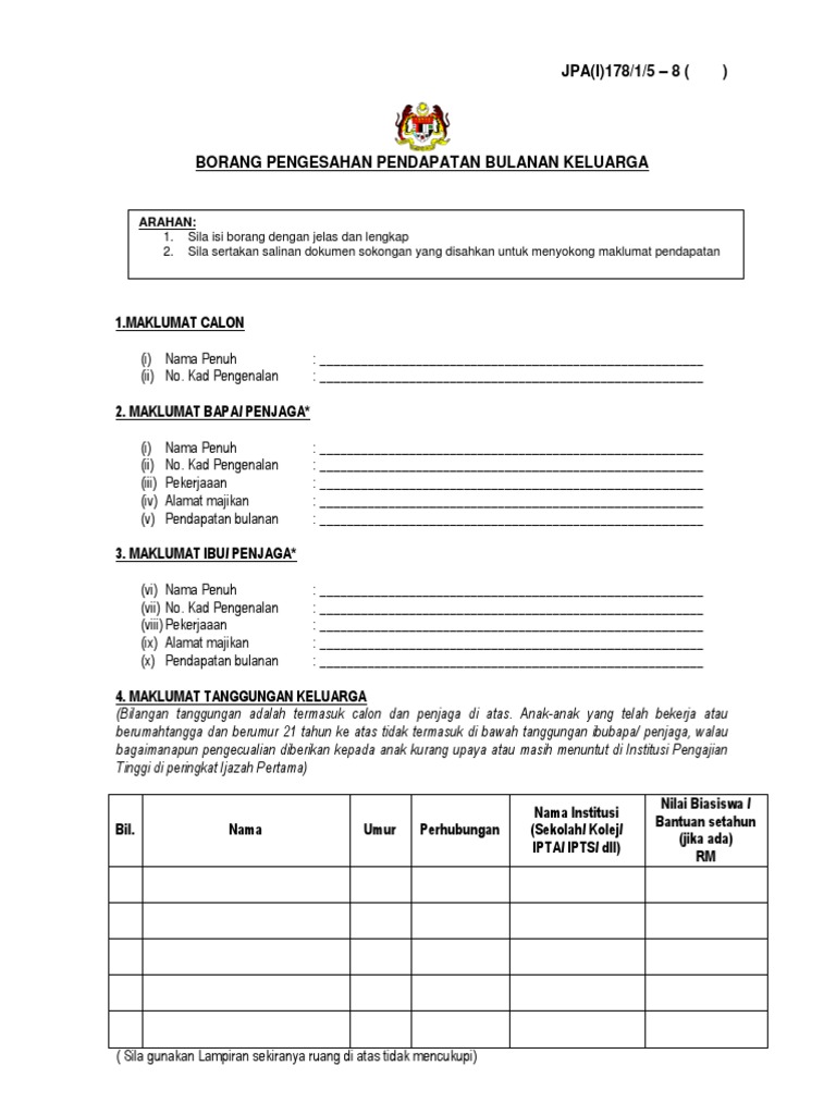 Borang pengesahan pendapatan keluarga hanya diisi oleh bapa ibu penjaga yang tidak mempunyai slip. Borang pengesahan pendapatan bulanan keluarga jabatan perkhidmatan awam. Borang maklumat pendapatan keluarga pelajar sesi akademik 2020 2021 peringatan. Dan perlu diserahkan semasa hari pendaftaran a.