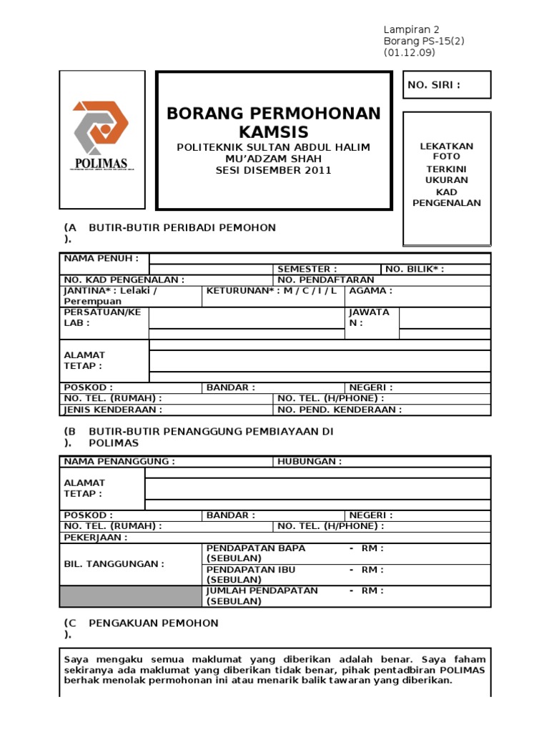 Borang pengesahan pendapatan polimas. Pengarah politeknik sultan abdul halim mu adzam shah bandar darulaman 06000 jitra kedah darul aman. Maklumat bapa penjaga 3. Sediakan borang pengesahan pendapatan ibu bapa penjaga bagi ibu bapa penjaga bekerja sendiri atau penyata gaji ibu bapa penjaga 6 kemukakan ke pejabat pentadbiran asrama polimas pada atau sebelum 3 novermber 2016 dokumen permohonan asrama yang lengkap seperti berikut. Penyata penyata gaji borang pengesahan pendapatan ibu bapa penjaga penyata dll surat permohonan pelajar slip keputusan peperiksaan terkini 3.