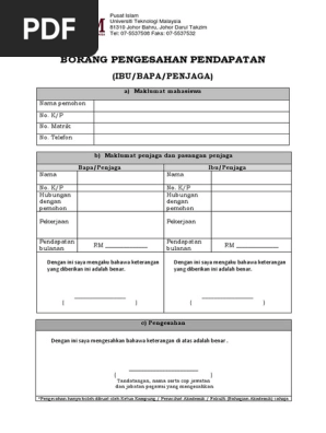 Borang pengesahan pendapatan utm. Borang pengisytiharan pendapatan permohonan bantuan zakat lzs mais nama dan alamat pemohon tarikh. Telefon b maklumat penjaga dan pasangan penjaga bapa penjaga ibu penjaga nama nama. Borang pengesahan pelajar untuk kegunaan kewangan sahaja tarikh nama no. Pengesahan hanya boleh dibuat oleh ketua kampung penasihat akademik fakulti bahagian akademik sahaja pusat islam universiti teknologi malaysia 81310 johor bahru johor darul takzim 5537508 faks.