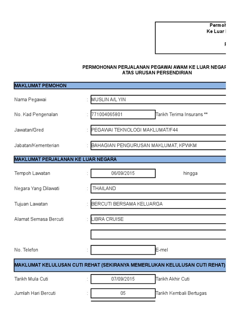 Borang permohonan keluar negara atas urusan persendirian. Lampiran a permohonan keluar negara atas urusan rasmi. Permohonan perjalanan pegawai awam ke luar negara atas urusan persendirian nama pegawai no. Maklumat hendaklah dilengkapkan dengan jelas dan menggunakan huruf besar. Emel jika ada.