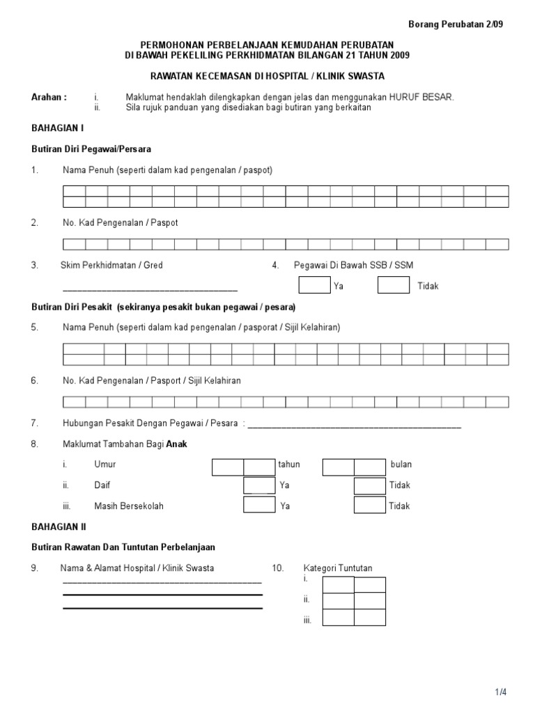Apabila anda sakit ketahui faedah perubatan dan bantuan berkaitan kos perubatan untuk veteran. Borang perubatan 1 09 permohonan perbelanjaan kemudahan perubatan di bawah pekeliling perkhidmatan bilangan 21 tahun 2009 ubat alat perkhidmatan perubatan rawatan i. Permohonan perbelanjaan kemudahan perubatan. Maklumat hendaklah dilengkapkan dengan jelas dan menggunakan huruf besar.