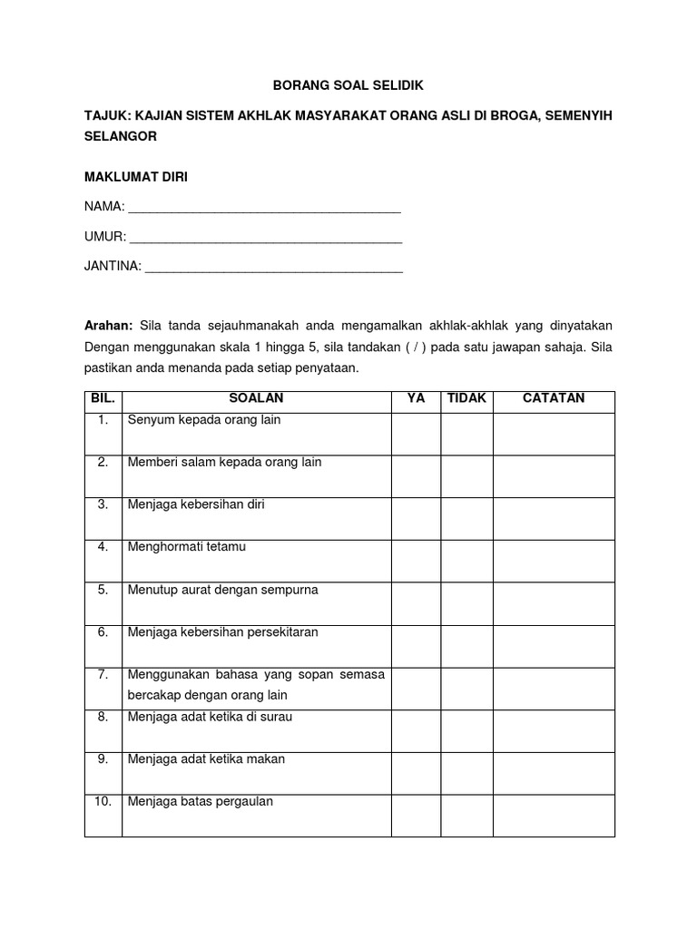 Borang soal selidik akhlak. Sila tandakan pada setiap pilihan anda. Borang soal selidik borang soal selidik ini dikemukakan untuk mendapatkan maklum balas dan menilai persepsi masyarakat melayu di daerah pengkalan hulu perak terhadap haiwan fasiq. Anda bisa mendownload atau mencetak gambar atau foto contoh borang soal selidik gaya hidup. Borang ini terdiri daripada empat bahagian a b c dan d yang perlu dijawab oleh responden kajian.