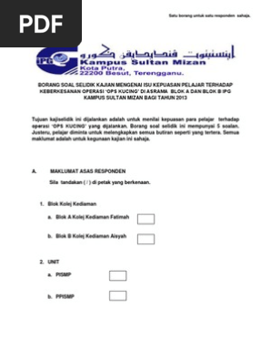 Smk jengka pusat borang kaji selidik mengenai persepsi pelajar puteri asrama jengka pusat terhadap peniaga borong pakaian di bandar pusat jengka. Sebarang maklumat yang diberikan dalam boring soal selidik ini akan dianggap rahsia dandigunakan untuk tujuan kajian sahaja 4. Dapatan kajian ini akan digunakan untuk menyuarakan suara pelajar kepada pihak atasan universiti malaysia terengganu dan pihak yang berkenaan. Kepada respondan yang dihormati diharapkan kerjasama dari pihak anda agar dapat meluangkan sedikit masa anda untuk menjawab soalan soalan ini.
