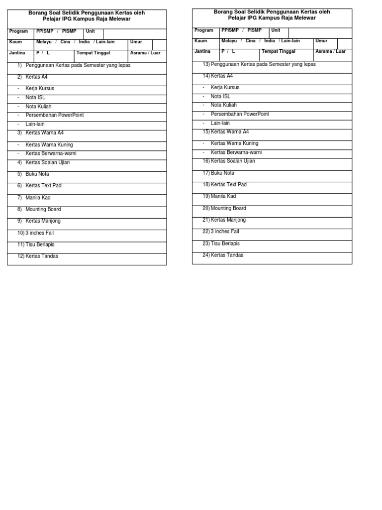 Soal selidik ini adalah bagi memenuhi keperluan penilaian berasaskan sekolah pbs untuk mata pelajaran pengajian am 900 4. Anda bisa mendownload atau mencetak gambar atau foto contoh borang soal selidik gaya hidup. Academia edu is a platform for academics to share research papers. Kerja kursus pengajian am makluman kepada responden.