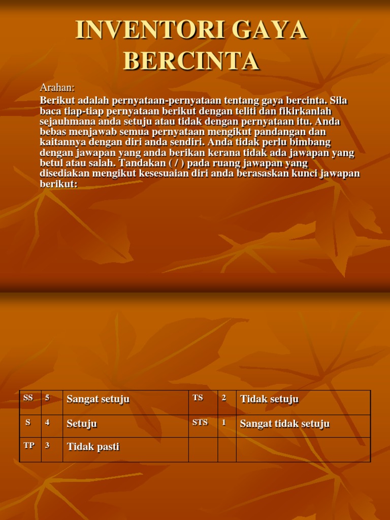 Kumpulan 6 borang soal selidik inventori gaya bercinta ai o. Rosenman m f ubahsuai oleh. Berikut adalah pernyataan pernyataan tentang gaya bercinta. Sila tuliskan nombor yang mewakili jawapan anda dalam ruangan yang disediakan berasaskan kekunci jawapan yang telah disediakan.