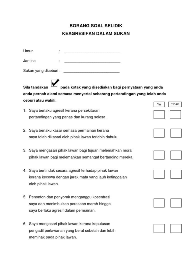 Borang soal selidik keagresifan sukan. Dan pentauliahan kokurikulum sp p kp tp stp 13 kursus kemahiran asas unit beruniform kelab dan persatuan sukan permainan 14 kursus kejurulatihan unit beruniform 2 12 2014. Contoh borang soal selidik berkaitan sukanya contoh borang soal selidik berkaitan sukan sea contoh borang soal selidik berkaitan dengan contoh borang soal selidik geografi 2018 contoh borang soal selidik kepuasan pelanggan contoh borang soal selidik produk contoh borang soal selidik geografi contoh borang soal selidik sistem pengangkutan contoh borang soal selidik keselamatan pekerja. Borang soal selidik kajian motivasi pelajar baru kolej matrikulasi selangor terhadap aktiviti sukan dan senaman tujuan soal selidik ini adalah untuk mendapat kefahaman tentang trend dalam tabiat bersukan dan bersenam dalam kalangan pelajar kolej matrikulasi selangor yang baru mendaftar. Borang kaji selidik tna.