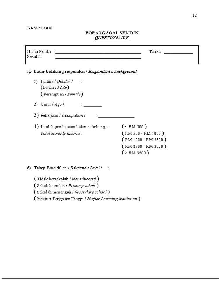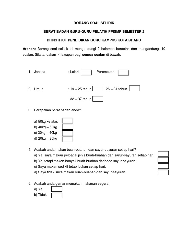 Borang soal selidik makanan segera. Responden telah dipilih secara rawak untuk menjawab borang soal selidik. Fakulti sains sosial universiti malaysia sarawak. Contoh contoh borang soal selidik dalam borang soal selidik soalan soalan perlu dikaitkan dengan objektif kajian anda sekurang kurangnya 10 soalan perlu diberikan kepada responden. Anda di halaman 1 dari 4.
