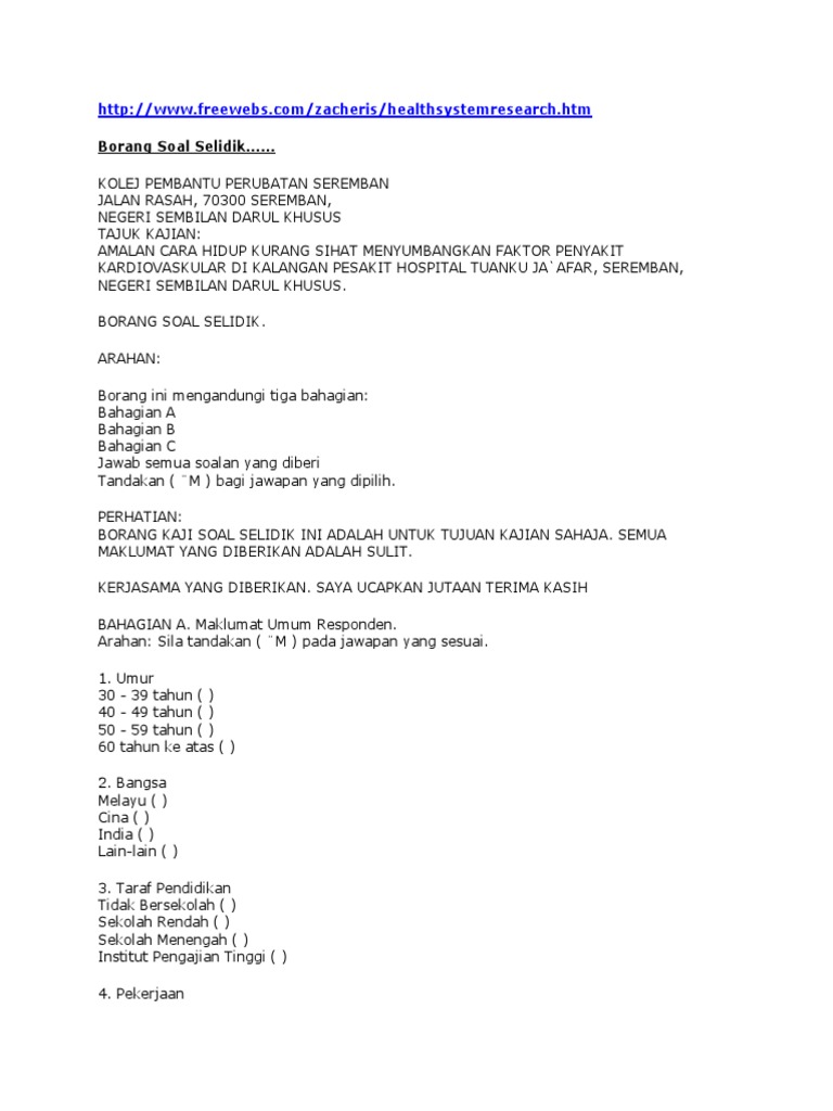 Borang soal selidik penyakit jantung. Academia edu is a platform for academics to share research papers. Academia edu is a platform for academics to share research papers. Borang ini terdiri daripada empat bahagian a b c dan d yang perlu dijawab oleh responden kajian. Dengan menggunakan borang soal selidik.
