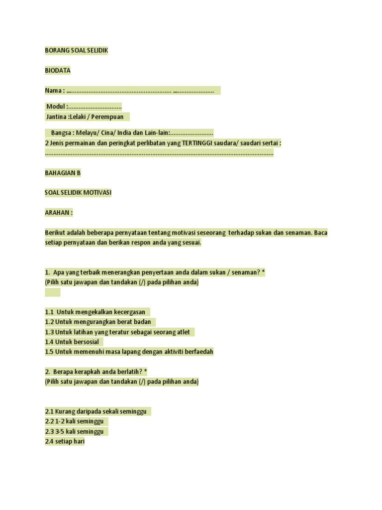 Borang soal selidik senaman. Borang ini terdiri daripada empat bahagian a b c dan d yang perlu dijawab oleh responden kajian. Sekiranya anda tidak mempunyai e mel atau tidak tahu mengisi soal selidik secara online pihak jabatan perangkaan malaysia dosm akan melakukan temu ramah secara bersemuka di tempat kediaman anda bermula pada 7 24 oktober 2020. Academia edu is a platform for academics to share research papers. If you continue browsing the site you agree to the use of cookies on this website.