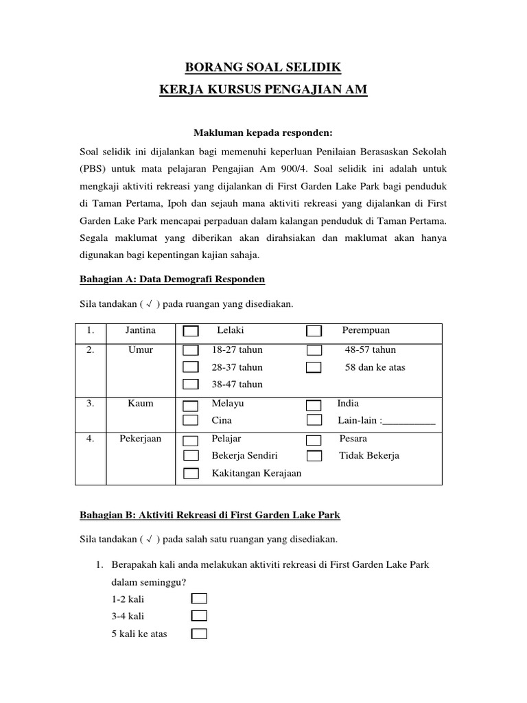 Taman rekreasi 3. Borang soal selidik kerja kursus pengajian am kod mata pelajaran 900 4 bahagian a. Bagi mencapai objektif yang telah ditetapkan ini penulis telah mengedar borang soal selidik kepada pengunjung di kawasan kajian. Pekerjaan kakitangan awam.