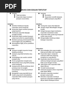 Borang soal selidik tertutup. Mereka biasanya termasuk jawapan seperti yang sangat buruk buruk baik sangat baik dan sebagainya. 1 weak 2 unsatisfied 3 simple 4 good 5 excellent. Kelebihan soal selidik tertutup ini ialah20 mudah ditadbir mudah menganalisis. Manfaat cara minum efek samping dll.