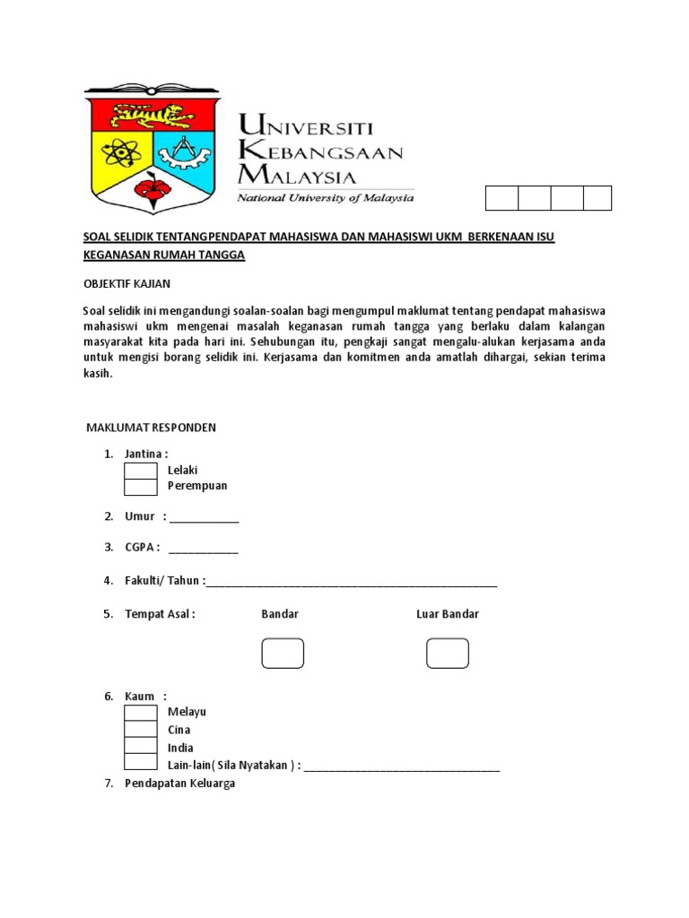 Journal of quality measurement and analysis jurnal pengukuran kualiti dan analisis jqma 5 2 2009 15 27 kesahan dan kebolehpercayaan soal selidik gaya e pembelajaran else versi 8 1 menggunakan model pengukuran rasch validity and reliability of the e learning style questionnaire else version 8 1 using the rasch measurement model rosseni din1 mazalah ahmad1 m faisal kz1 norhaslinda. Borang soal selidik tahap keberkesanan prototaip aplikasi mobil ukm. Address with social icon. Maklumbalas ini dapat membantu perpustakaan ukm untuk meningkatkan prestasi dan menambahbaik mutu perkhidmatan dan tahap kepuasan pelanggan.