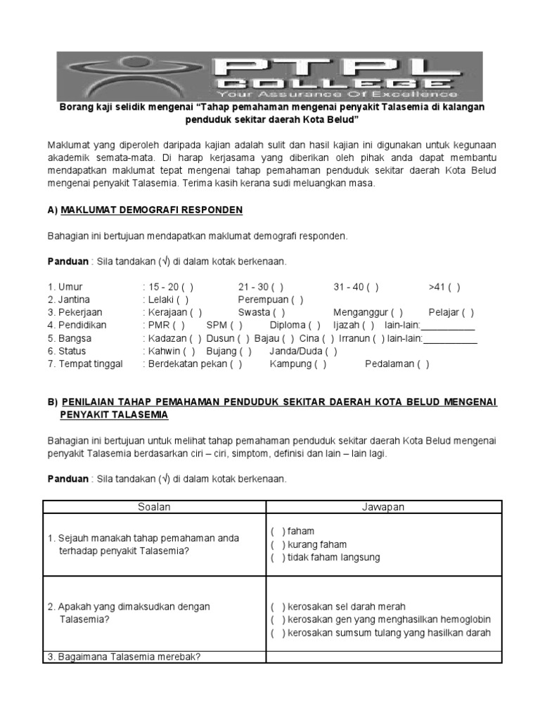 Borang kaji selidik kepuasaan pelanggan. Butik azahfandi sedang berusaha untuk meningkatkn kualiti perkhidmatan kepada semua pelanggan bagi mencapai tujuan tersebut dipohon kerjasama pihak tuan puan untuk memberi maklum balas dan cadangan komen dengan melengkapkan borang soal selidik. Borang ini terdiri daripada empat bahagian a b c dan d yang perlu dijawab oleh responden kajian.