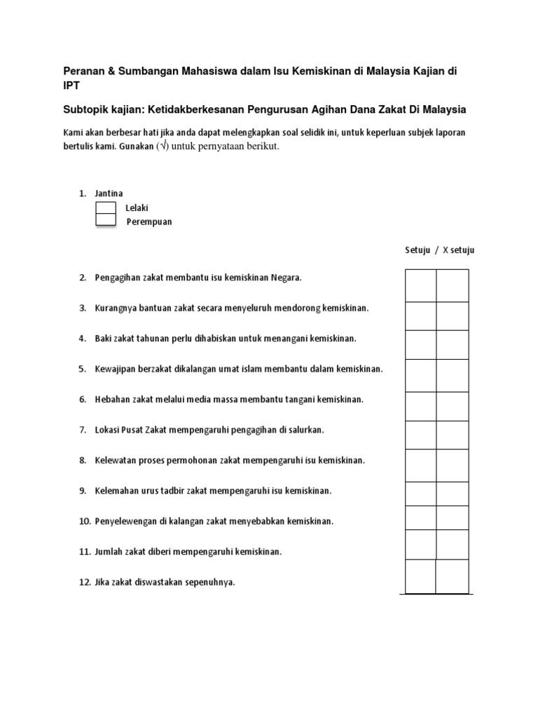 Related posts to contoh borang soal selidik zakat. C2f memuat turun majalah asnaf c2g memuat turun tender. Contoh borang soal selidik contoh borang soal selidik geografi pt3 2017 contoh borang soal selidik cctv contoh borang soal selidik pelancongan contoh borang soal selidik gempa bumi contoh borang soal selidik contoh borang soal selidik kepuasan pelanggan contoh borang soal selidik etika kebersihan contoh. Soal selidik asnaf fakir dan miskin tujuan kajian tujuan kajian ini adalah untuk mengkaji keberkesanan agihan zakat dalam membasmi kemiskinan di kalangan asnaf fakir dan miskin di negeri sembilan.