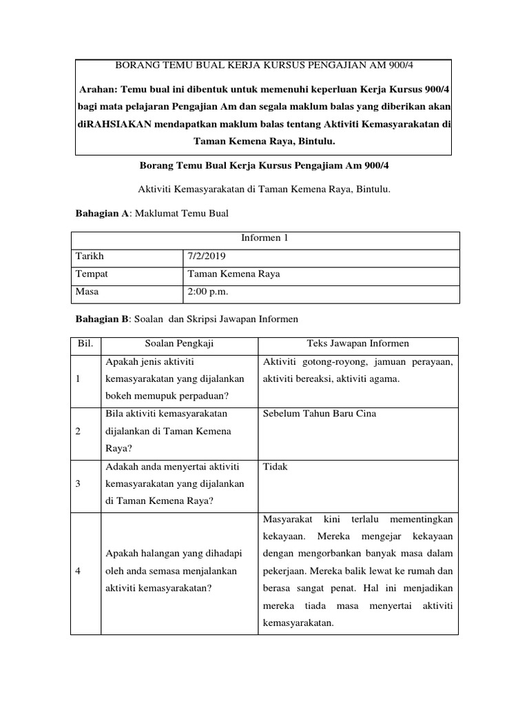 Penggunaan gelanggang serba guna dalam kalangan pelajar tingkatan lima di smk baru miri sarawak. Contoh skrip temu bual kerja kursus sejarah jeya kumar. Maklumat am dan soalan soalan temubual ini dikemukakan kepada informan secara lisan. Contoh gabungan borang temubual dan pemerhatian matrik analisis data kualitatif gabungan data pemerhatian dan data temubual bil.