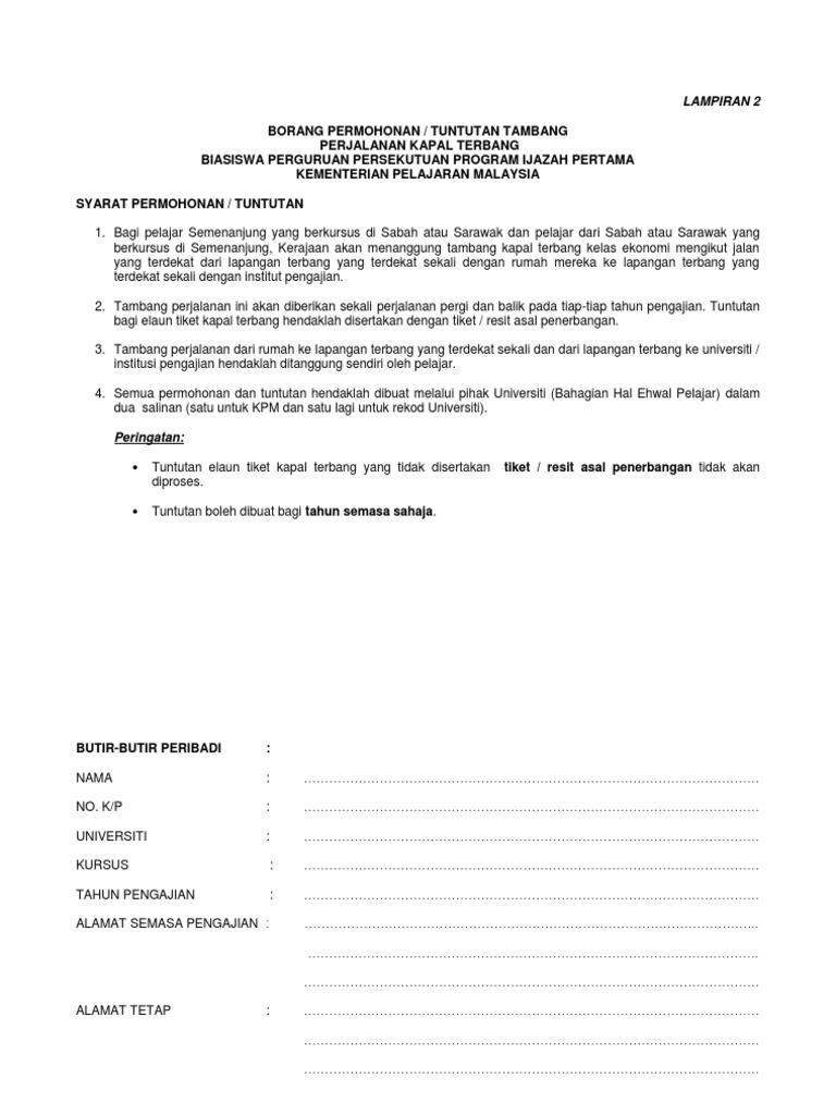 Borang pembetulan maklumat calon. 1 borang permohonan ke luar negara 2 borang surat pengesahan diri pengakuan pegawai 3 borang pendaftaran kereta untuk tuntutan elaun perjalanan kenderaan 4 borang penukaran peserta kursus tugas rasmi luar 5 borang permohonan email rasmi mara 6 borang keahlian koperasi. Pdf borang permohonan kemudahan tambang mengunjungi wilayah asal pekeliling perkhidmatan bil 22 tahun 2008 doc 69 kb. Portal rasmi kementerian pendidikan malaysia.