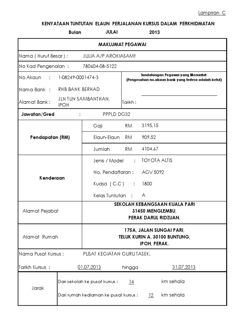 Borang tuntutan perjalanan kursus. Format borang tuntutan perjalanan. Tuntutan perjalanan berkursus yang dikemukakan oleh pegawai adalah tertakluk kepada peraturan dan pekeliling yang berkuatkuasa seperti berikut tajuk arahan perbendaharaan tuntutan perjalanan pegawai awam. 4 30 perkara maklumat yang perlu disemak rujukan tuntutan perjalanan kerana menjalankan tugas rasmi di dalam negeri tidak layak tuntut elaun kenderaan melainkan beberapa keadaan tidak termasuk tentera dan polis. Dalam negeri surat memo arahan kepada pegawai yang menjalankan tugas rasmi mesyuarat kursus latihan yang diarahkan sama.