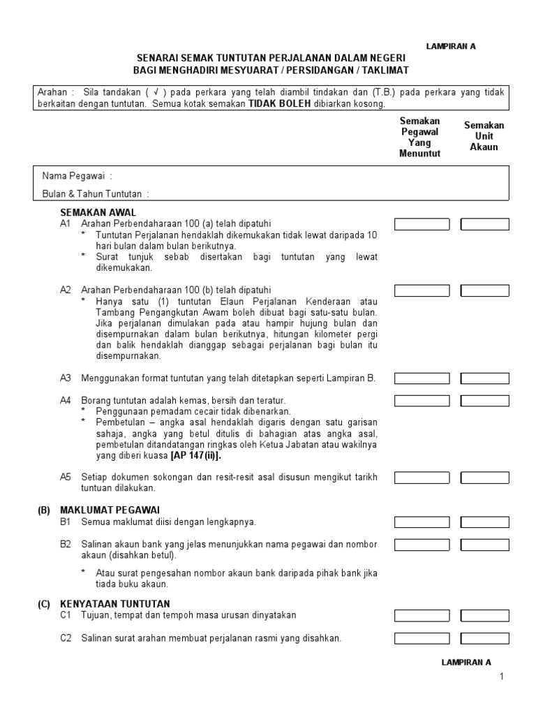 C butir butir seperti yang dinyatakan dia atas adalah benar dan saya bertanggungjawab. Borang tuntutan 20 lampiran 21 lampiran a jadual perubahan perbandingan bagi pegawai yang memilih untuk tidak menerima sistem saraan malaysia 22 lampiran b kadar elaun makan bayaran sewa hotel elaun. B tuntutan ini dibuat mengikut kadar dan syarat seperti yang dinyatakan dibawah. Lampiran a1 maklumat akaun bank terkini dilampirkan bersama setiap baucer manual nama penerima.