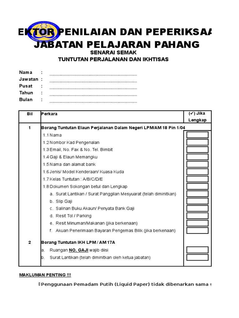 Jabatan perkhidmatan awam blok c1 c3 kompleks c pusat pentadbiran kerajaan persekutuan 62510 wilayah persekutuan putrajaya malaysia. B tuntutan ini dibuat mengikut kadar dan syarat seperti yang dinyatakan di bawah peraturan bertugas rasmi yang berkuat kuasa dan atau peraturan berkursus yang berkuatkuasa. Mesyuarat jawatankuasa pengurusan kewangan dan akaun jabatan perkhidmatan awam jpa bil 1 tahun 2005 pada 10 mac 2005 telah. 2 3 tuntutan perjalanan bagi bulan yang sama hendaklah dimasukkan ke dalam satu 1 borang tuntutan perjalanan sahaja.