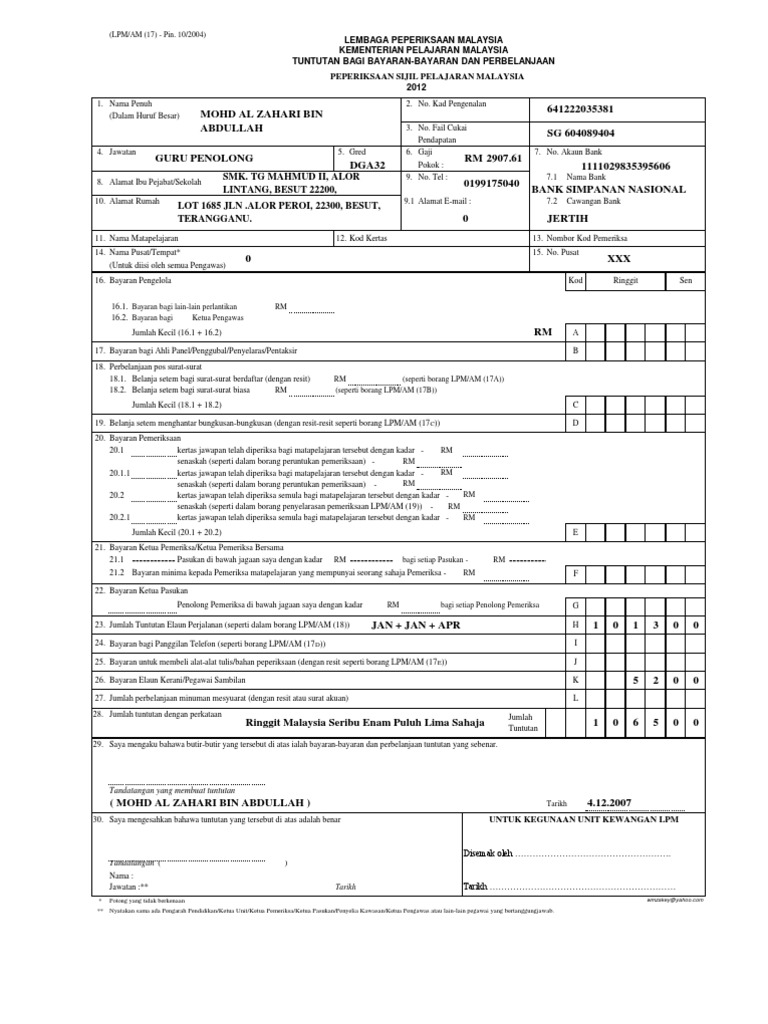 Tuntutan pengawas upsr 2012 1. Uploaded by azami tohet. Berikut disertakan dokumen bagi tuntutan pengawas upsr 2017. Pusat 0kodringgitsen17 jumlah tuntutan elaun perjalanan lampiran a a18 belanja setem bagi surat biasa dan surat berdaftar borang lp am 17b b19 belanja setem menghantar bungkusan bungkusan borang lp am 17c c20 bayaran bagi panggilan telefon borang lp am 17d d21 bayaran untuk membeli alat alat tulis bahan peperiksaan borang lp am.