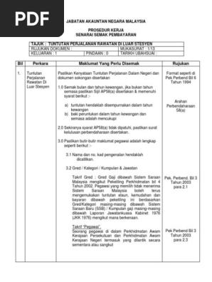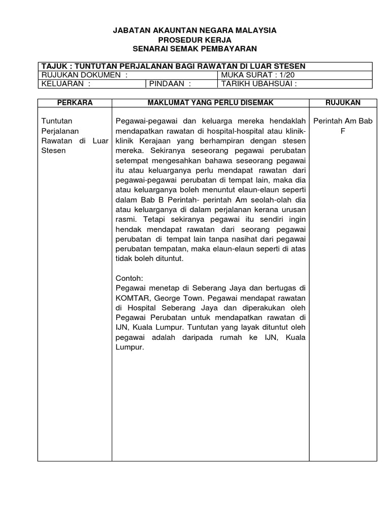 1 0 borang tuntutan rujuk lampiran b yang diterima daripada pemohon dan dicop tarikh terima 2 0 semak borang tuntutan dan dokumen sokongan. Rawatan di para 4 1 1 semak kenyataan tuntutan tarikh bertolak dan pulang para 4 1 1 tuntutan perjalanan luar stesyen 5 0 elaun perjalanan. Tuntutan elaun pertukaran keluar stesen author.