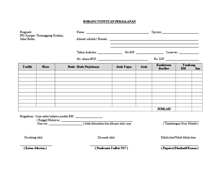 1 4 borang tuntutan hendaklah diisi dengan lengkap dan dikemukakan bersama sama dengan dokumen kelulusan perjalanan dan dokumen sokongan lain seperti bil resit atau lain lain dokumen yang dapat mengesahkan perjalanan atau perbelanjaan. Tuntutan perjalanan bagi menghadiri acara rasmi kerajaan 19 18 19. B tuntutan ini dibuat mengikut kadar dan syarat seperti yang dinyatakan di bawah peraturan peraturan bagi pegawai bertugas rasmi dan atau pegawai. Dan brunei darussalam sahaja pengakuan saya mengaku bahawa.