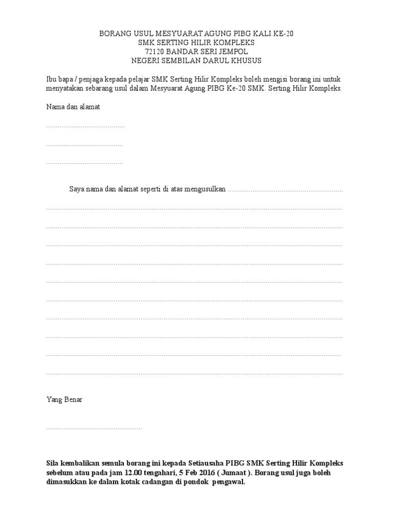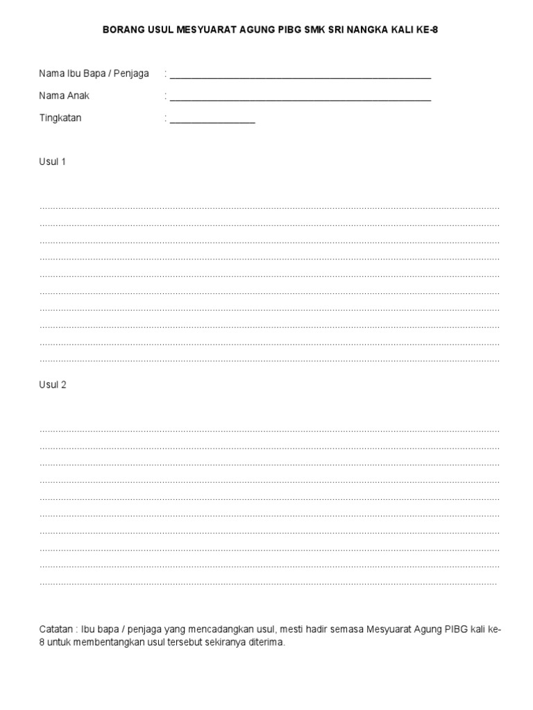Borang usul pibg. 11 1 borang usul borang jawapan kehadiran 11 2 borang maklumbalas ajk pibg smk cheras 12 0 penutup diharapkan program ini berjalan lancar dan mendapat kerjasama yang baik dari warga guru dan ibu bapa. Akta dan undang undang. Mesyuarat agung pibg kali ke 14 2018. Agm pibg smkttdi 2017.