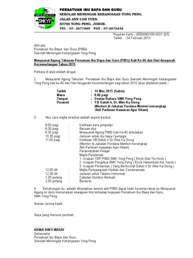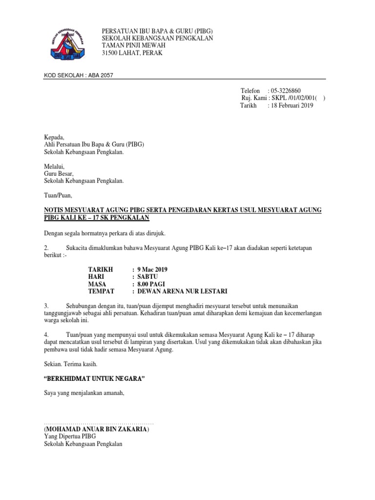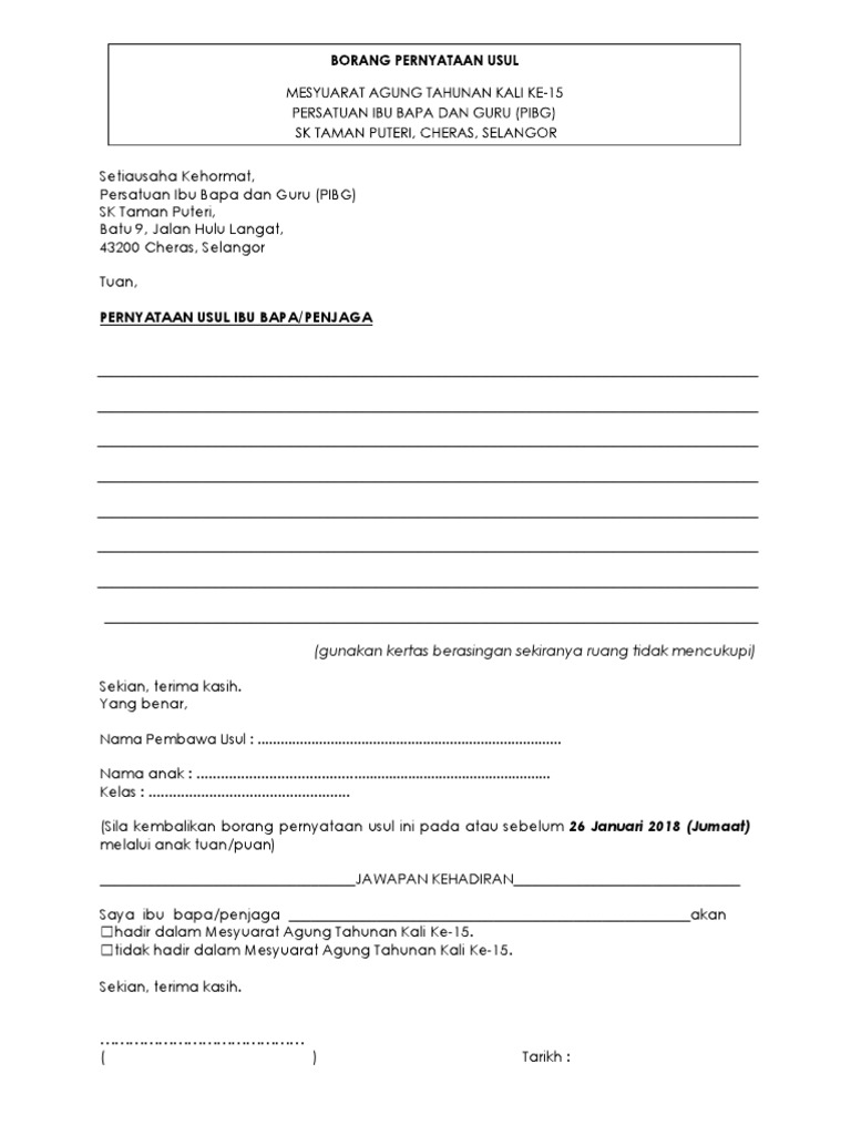 Jemputan mesyuarat agung pibg samtaj kali ke 26 dengan segala hormatnya pihak sekolah dan pibg samtaj menjemput ibu bapa penjaga untuk hadir ke mesyuarat tersebut pada tarikh. Download pdf 22kb ibu bapa penjaga juga boleh mengisi borang usul secara online sangat mudah. Sila kembalikan borang pernyataan usul ini pada atau sebelum 30 januari 2018 selasa melalui anak tuan puan atau menerusi faksimili sekolah 03 77267540 atau email kepada wea0210 edu 1govuc gov my. Notis mesyuarat agung tahunan persatuan ibu bapa smkttdi kali ke 38.